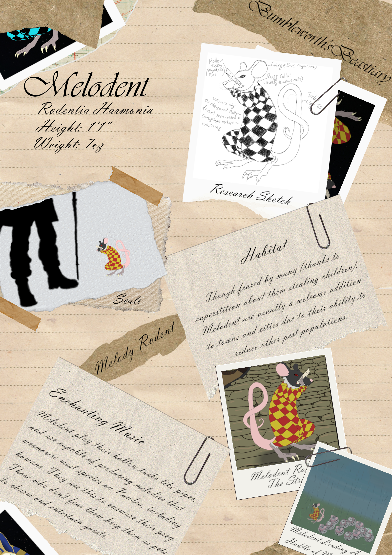 Of all the critters that call Pandea home, none are more divisive than melodent. This small rodent is plagued by a past littered in superstition. Fear follows it wherever it goes, but so too does another feeling. Awe. Both emotions stem, in part from its impressive abilities. Sprouting from its bottom jaw are two large hollow tusks. Melodent uses these teeth in a rather unusual way. By blowing air through the bottom of the tubes it can play these tusks like one would a flute. Creating a variety of rather exquisite melodies. It is this music that inspires awe and wonder into the hearts of many people. Yet its purpose is where the seeds of fear sprouted.