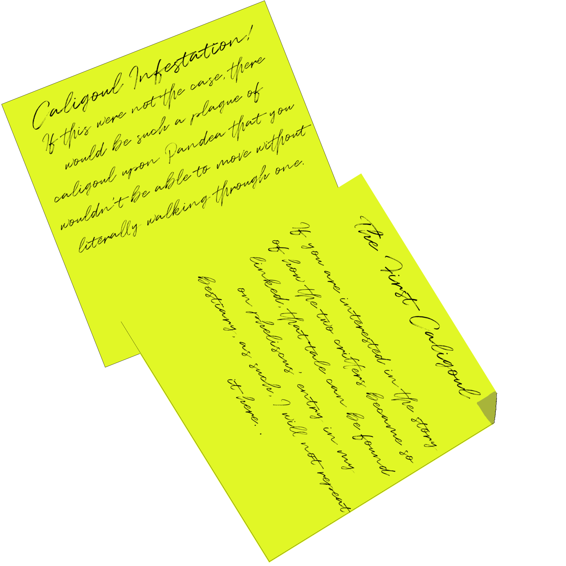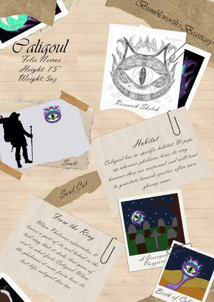 Caligoul are the shadow of the past lives of pheliscus, they are born when a pheliscus uses its rejuvenation power and loses one of the rings from its tail. The life of a caligoul will end whenever the pheliscus it spawned from loses its final tail ring, and its last life ends.
